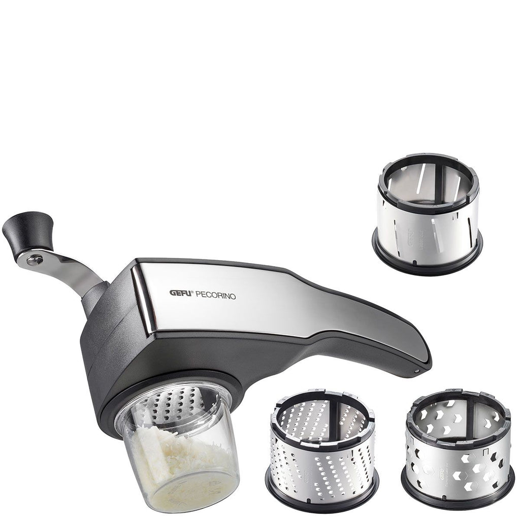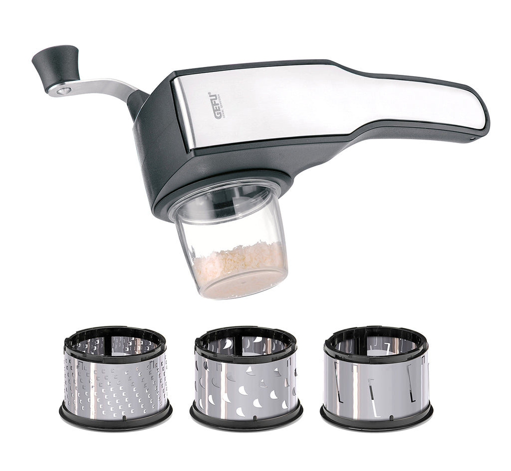-GEFU- Big Sale "PECORINO" Trommelreibe mit 3 Schneidtrommeln und Auffangbehälter